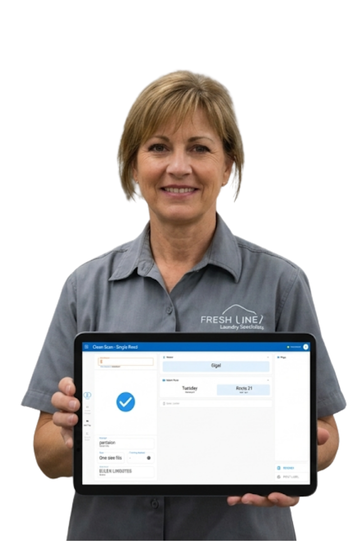 Sheila works on the production floor, scanning and processing garments throughout the day. Her interface is intentionally simplified to allow her to work quickly and efficiently. She sees operational details such as the wearer, return route, product type, size, finishing method, and customer information. This helps her confirm that each item is processed correctly and sent to the right destination.